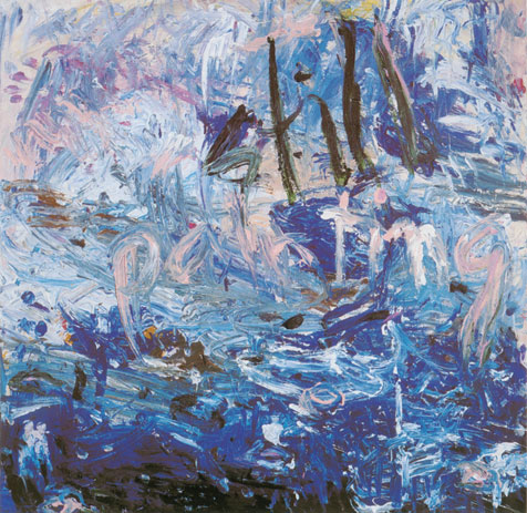 „Still Painting“ nennt Evelyn Garden ein Bild, das um die Jahreswende 1999/2000 entstanden ist: trotzig arbeiten sich die beiden Worte aus einem bewegten Farbmassiv heraus. Der schwarzblaue Grund verbindet sich fließend mit Weiß und aufgehellten Magentatönen zum luftigen Firmament. Pinselhiebe wogen ungestüm und uferlos, lösen die Grenze zwischen Himmel und Erde, Luft und Wasser auf. In diesem Farbstrudel und dem amorphen Kontur steht als einzige Klarheit die Behauptung, mehr noch das untrügliche Wissen um den Status quo der Malerei: still painting! Ein Berg tut sich auf, dessen Spitze in den Wolken nur zu ahnen ist - kein Ende absehbar. Gleichsam blicken wir in einen Meeresspiegel, der unendliche Tiefen verspricht, ohne die Gefahren des Tiefgangs zu verbergen - helle Schaumwirbel klären das Dunkel wie Wegweiser auf, doch kein Sterblicher vermag über das Wasser zu gehen. Die Landschaft wird zur Chimäre. Die Kunst allein und mit ihr seit Urzeiten die Malerei vollzieht diesen Schritt ins Unmögliche, versinnbildlicht solides Fundament und labile Oberfläche in Einem, führt mithin an die bipolare Einheit von Leben und Tod.